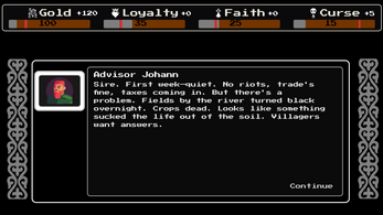 Cursed Throne is a medieval kingdom management game where you play as a king balancing four critical resources: Gold, Loyalty, Faith, and Curse. Make strategic decisions through dialogue choices with advisors, merchants, priests, and other characters. Your goal is to survive 5 weeks without letting your kingdom collapse.